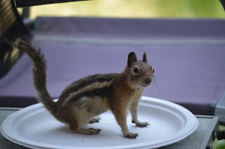 Aswe sat around later that afternoon, we were visited by several chipmunks, but one ("Jumper" was a particular favorite). He was unafraid, and checked every inch of my trailer, our chairs (empty and occupied), our clothes, our camp stove, the old camp fire, my ladders--climbing up everything he could to check things out. He was so fearless, he would climb into your lap if you did not shoo him away.